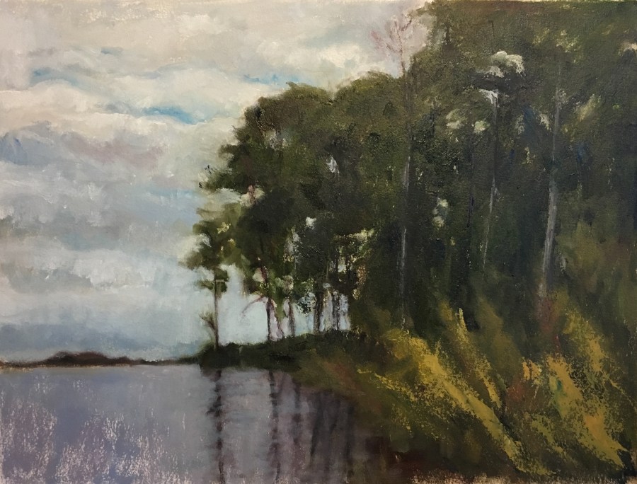Dark Pines on the Bay. Oil on Arches Oil Paper. 16 x 12.