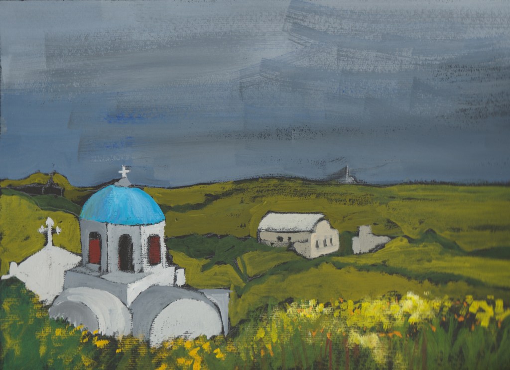 Ann Rossilli. Stormy April;, Santorini.. Gouache 8.5″x11.5″ $300.